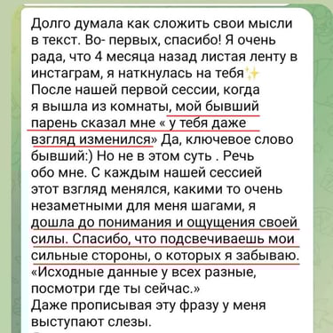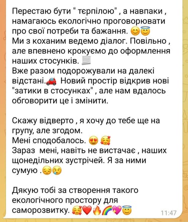 Моє завдання допомогти виявити та змінити ті сценарії, які роками керували твоїми стосунками, щоб ти змогла будувати близькість без страху та втечі.
